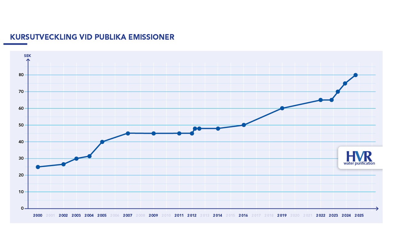 På denna sida kan du köpa eller sälja HVR aktier – direkt från existerande aktieägare. Eftersom aktien inte är noterad finns inget listpris. Eftersom vi inte har mäklartillstånd får vi inte heller själva informera om priser och har inte heller den informationen eftersom affären görs upp privat mellan köpare och säljare och helt anonymt för utomstående. Som ett riktmärke anger vi därför priset på aktien vid senaste nyemissionen. För HVR Water Purification AB:s del visas det senaste nyemissionspriset i diagrammet i ovanför.